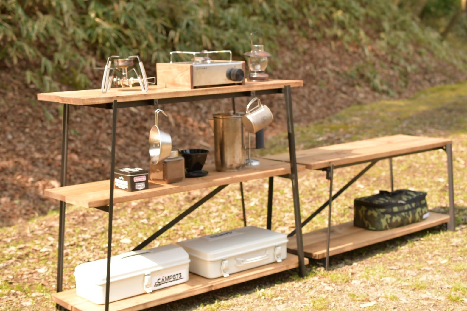 ねじ止め無し、溶接無しの、完全組み立て式で、女性でも簡単に組み立てができる、シンプル構造のアイアンラックです。一枚の鉄板から切り出し、曲げ加工を加えることで、抜群の安定性と軽量化を実現。フレームだけで自立するので、設置も簡単!!平たくスタッキングできて移動もラクラク。キャンプではもちろん、インテリアとしてもお使いいただけます。
